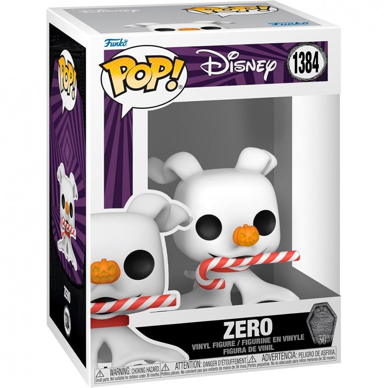 funko pop! figure depicts zero, the ghost dog from "Nightmare Before Christmas" wearing a special costume with a candy cane to celebrate the 30th anniversary of the movie.Size approximately 6.5 cm.