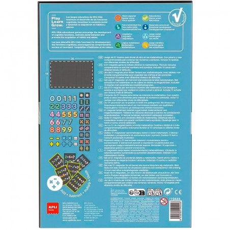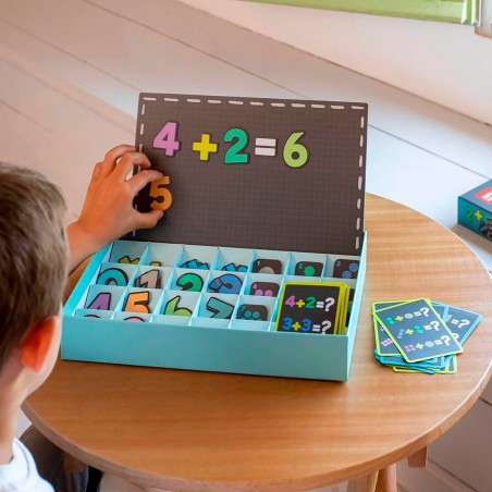 Magnetic game model Numbers to introduce them to the world of mathematics. The game contains 1 magnet stage of 280 x 180 mm to fit in the base of the box with compartments to be able to order the numbers and symbols. 51 magnets of numbers and symbols and 15 cards with examples for the child to learn his first mathematical operations are included. This product helps develop fine motor skills, memory and imagination, encourages concentration and promotes logical-mathematical work.