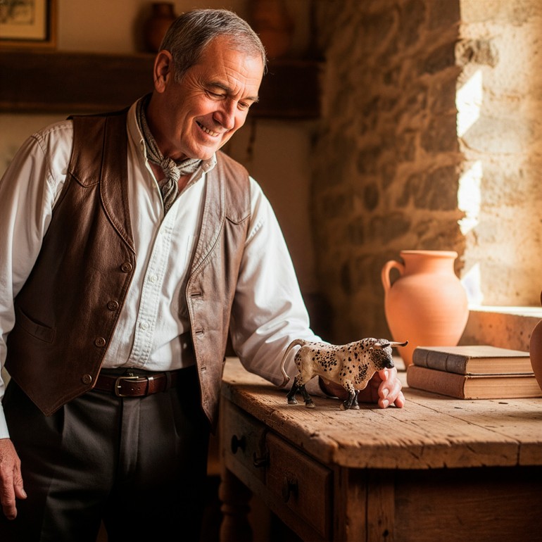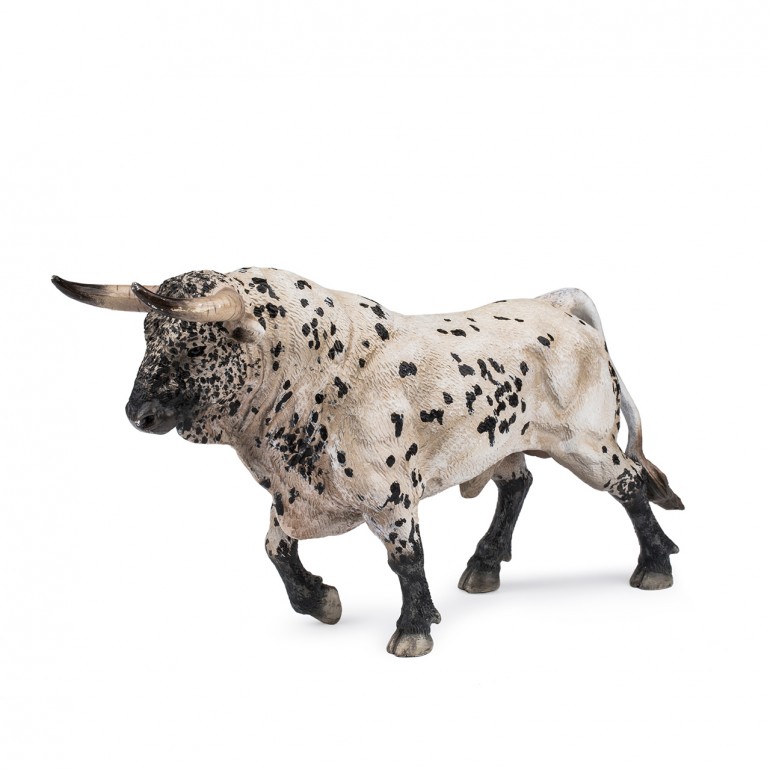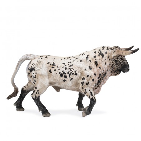 The Toro bravo is a type of bovine that comes from the Uro (neolithic wild bull) already introduced in the North of Spain and Portugal by the Celts. The current bull is the result of a selection carried out since the 18th century by Spanish breeders, choosing for reproduction those specimens with different characteristics and with Bravery as a common denominator for all of them. It is an animal with a strong temperament, used to living in freedom, it is surly and distrustful, which makes it sharpen its instincts and learn easily. The Bravo bull symbolizes the popular festival and appears in all the arts from cave paintings to the most modern trends in Spanish culture (paintings, engravings, cinema and literature). It is one of the greatest jewels of world zootechnics. The bull developed by Deqube is made of resin, like a real replica with the maximum detail in its rags. It is hand painted. In this Deqube model, the Bravo bull is in a relaxed attitude trotting with a coat called Ensabanado and moonlight where on the completely white skin and hair, it has a large number of black polka dots all over the trunk.