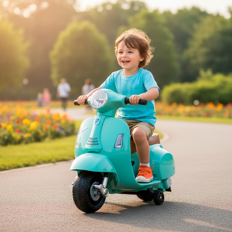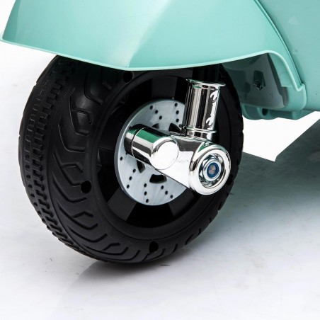 Mini 6V rechargeable battery scooter in sky blue for the little ones. Being a motorcycle designed for the little ones, it is very easy to handle, simply by pressing the pedal it will go forward with a maximum speed of 3 km/h. Its 4 wheels, 2 wide and 2 auxiliary wheels, ensure that your baby travels in a stable and safe way. Even the smallest of the house can enjoy realistic driving with this motorcycle that has a headlight (front with real light), handlebar with horn and pedal like the real ones. The headlight lights up when you step on the pedal. This electric motorcycle is officially licensed by VESPA and supports a weight of up to 25 kg. Not recommended for children under 18 months.