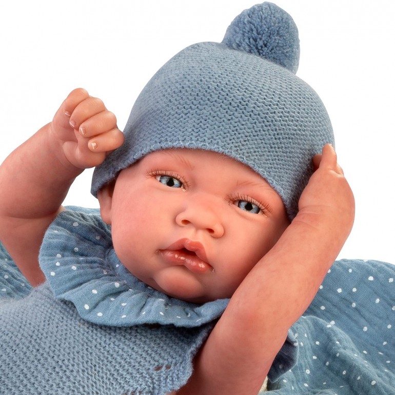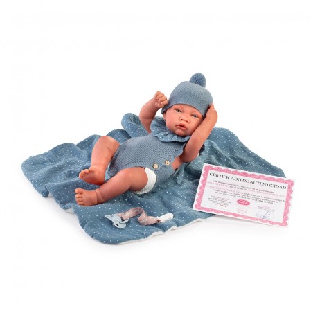 Sweet Reborn Born as a couple, she is like a real baby, with all the characteristics of a real baby: her rosy and soft skin, her veins, her manicure... All done by hand, so that she is a baby like you. It has a sexed vinyl body with all the details of a real baby. Sweet Reborn Born as a couple is a sweet baby who will really enjoy playing with you. She wears a soft romper to match her pom-pom hat and a soft polka-dotted blanket with which you can lull her and hug her to sleep. Plus he´s wearing a diaper like a real baby. It weighs 1090 grams. and measures 42 cm. And it is accompanied by its certificate of authenticity, with a unique numbering that guarantees its exclusivity as Antonio Juan Reborn Dolls!