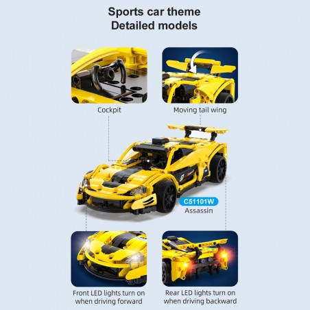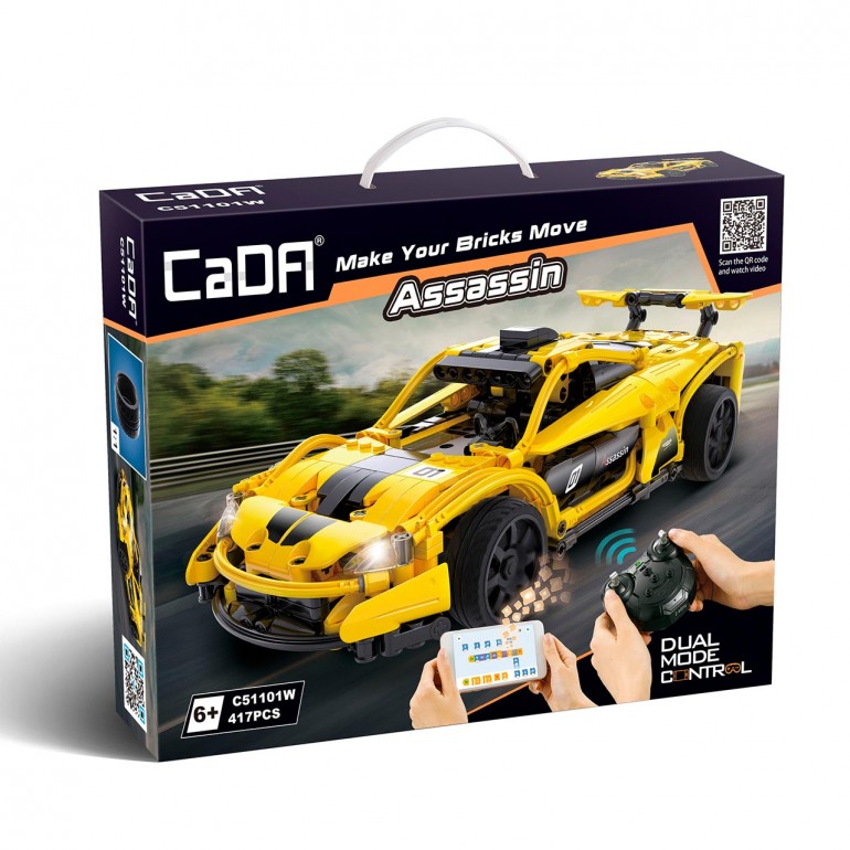 Assasin car, Technic assembly with front and rear lights to enjoy driving. Make turns with the Radio control system and the 4 modes of the CaDA Smart App. Available on IOS and Android.