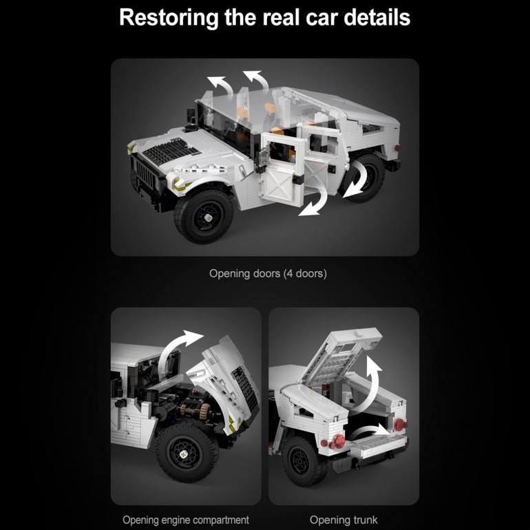 Detalles muy cuidados en este HUMVEE tanto en interiores como en exteriores. En interiores destacan sus asientos reclinables, el panel de mandos, la radio e incluso la rejilla de ventilación, todo al mínimo detalle incluso la transmisión del volante maneja el movimiento de las ruedas y con una calidad altísima. .En exteriores todos los iconos típicos de este magnífico coche. Todas las puertas son móviles incluso la del motor y maletero . .Posibilidad de añadir equipo de Radio control, se vende por separado.