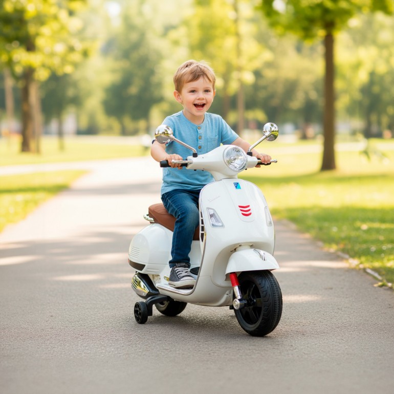 VESPA 12V electric scooter (Includes 2 batteries of 6V) It has LED headlights, LED taillights, music, USB and MP3 interface, side wheels for greater stability, etc... The little ones will enjoy driving this bike imitating adults. This electric motorcycle is officially licensed by VESPA. Not recommended for children under 3 years old.