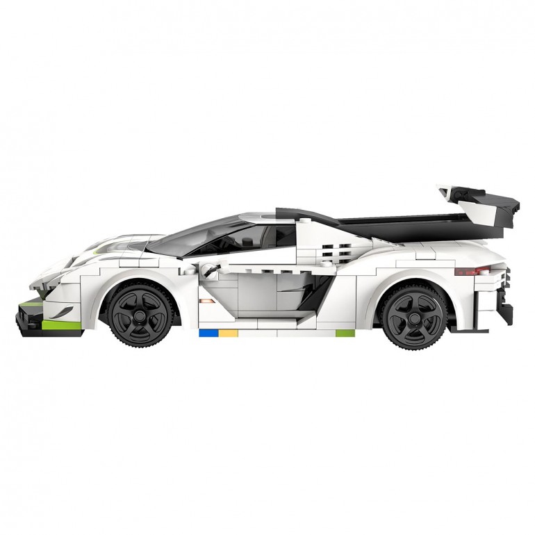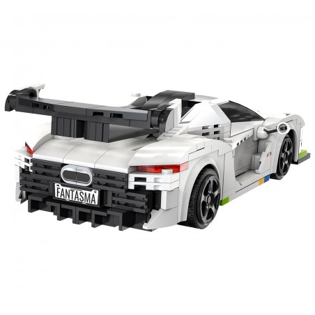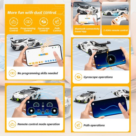 White sports car with green aerodynamic details. The vehicle can be controlled by the 2.4GHZ remote control and Bluetooth app, available in Android and IOS versions. Enjoy your shifts with the 4 driving modes offered by the CADA App (gyroscope, programming scratch, control from your mobile or edit your own route).