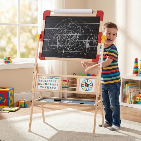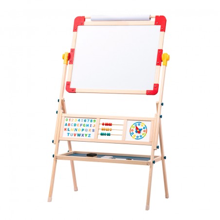 Wooden board 2 in 1. On one side you can paint with chalk and on the other side you can use markers or magnets. It includes letters, an abacus to encourage learning to count and a clock. It also includes an eraser and some accessories. The products are FSC certified, which guarantees that the wood they are made of comes from forests that preserve biodiversity and are managed in a beneficial and environmentally responsible way.