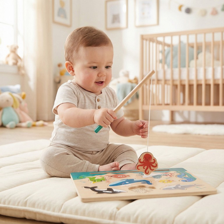 Magnetic wooden fishing puzzle. It contains different pieces of marine animals as well as a fishing rod to catch them one by one. The products are FSC certified, which guarantees that the wood they are made of comes from forests that preserve biodiversity and are managed in a beneficial and environmentally responsible way.