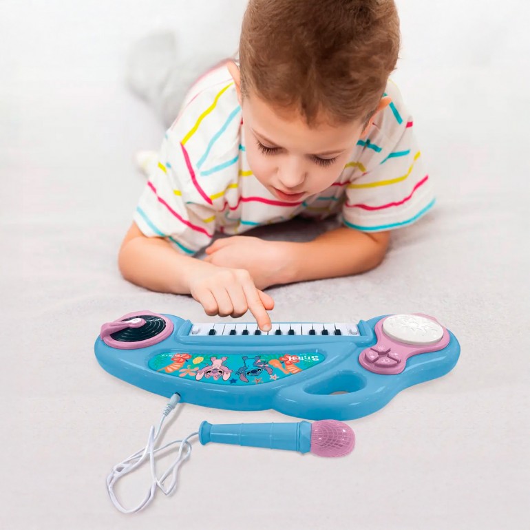 Fun Stitch electronic keyboard. It has 4 types of sound effects, LED lights and 1 microphone included.