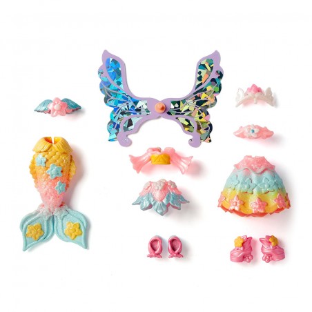 Includes 1 doll and 3 outfits. Discover her 3 unique faces with a single click. 3 different models to collect: hearts, rainbow and pearl.