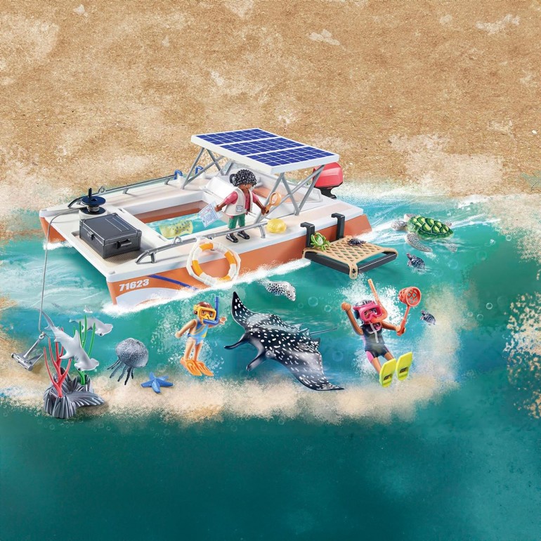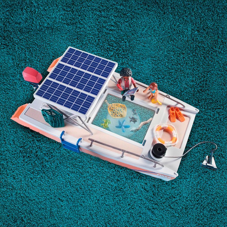 Explore the wonders of Australia with PLAYMOBIL´s sustainable WILTOPIA Reef Analysis Platform. Through the glass bottom of the catamaran you can observe the fascinating flora and fauna of the coral reef. This natural wonder provides habitat for a wide variety of species, observable from the solar-powered electric boat: two young hammerhead sharks, two rays, a jellyfish and even a sea turtle with its young, among many other marine animals, swim along the transparent bottom of the boat with magnifying glass function. With diving equipment, research tools and lots of accessories.