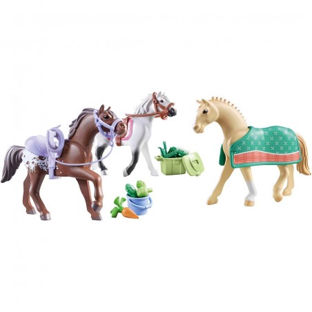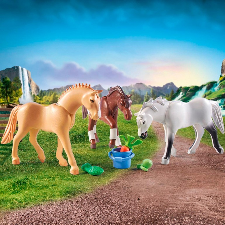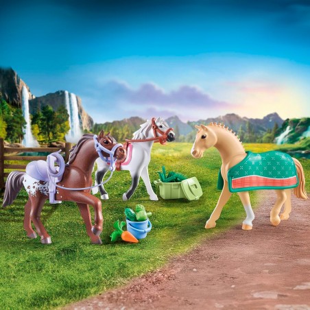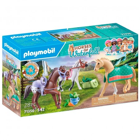Waterfall Ranch has room for many more horses in both the stable and paddock! A Morgan, a Quarter Horse and a Shagya Arabian are waiting to experience exciting riding adventures with Waterfall´s equine friends. The set includes three caballs with different riding accessories!