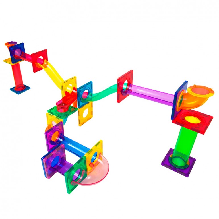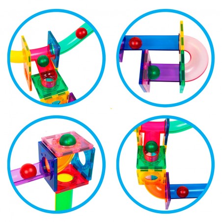 The 3D maze track allows for multi-layered layouts that allow children to focus and use their creative minds to develop the logical thinking necessary to successfully make the marble slide through the track. It includes 9 different piece shapes including columns, slopes, centrifugal funnels U-turns and a new innovative sliding and dropping intersection that allows marbles to slide through connecting tracks or turn and drop into another section of the maze design.