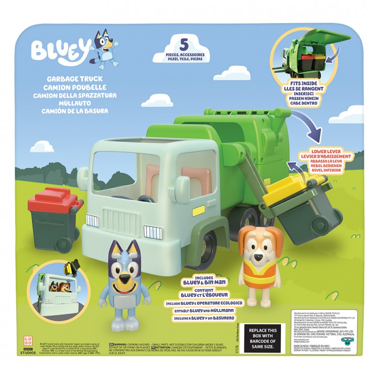 Bluey´s garbage truck includes Bluey, an exclusive garbage lord figure and two containers.