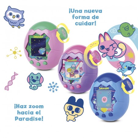 Tamagotchi Paradise, the new way to raise your Tamagotchi! Now the device has a Zoom functionality to travel from Tamagotchi space to the character´s own cell. There are 3 different models, each with a different space and theme: Land, Sea and Air. There are up to 12 different species and you can take care of a total of 1,000 characters.