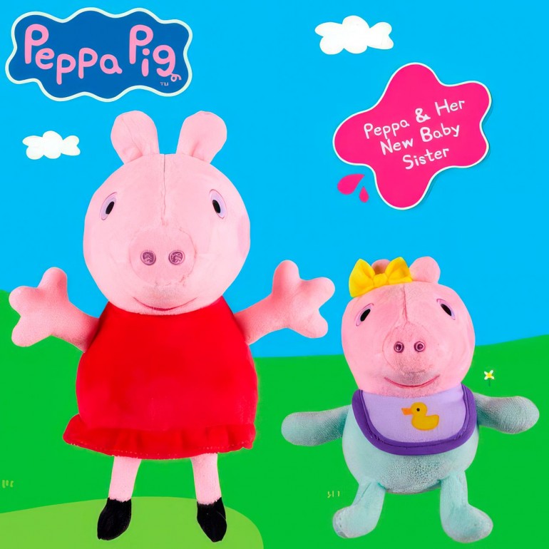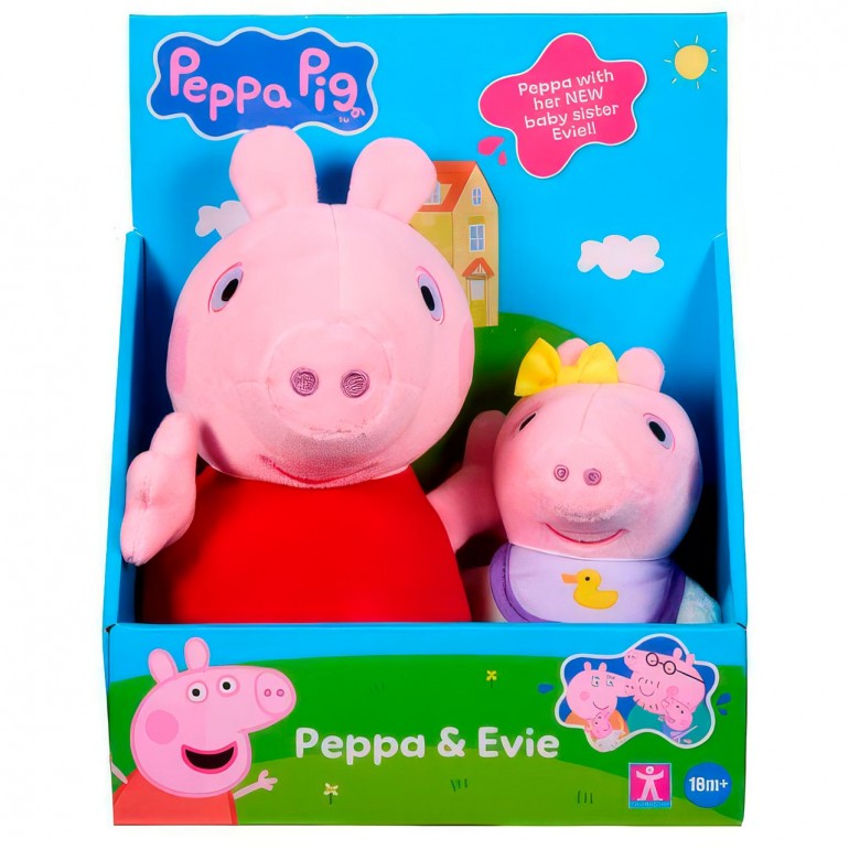 Pack of two soft toys, consisting of Peppa pig of 18 cm and his little sister of 11 cm in display box.