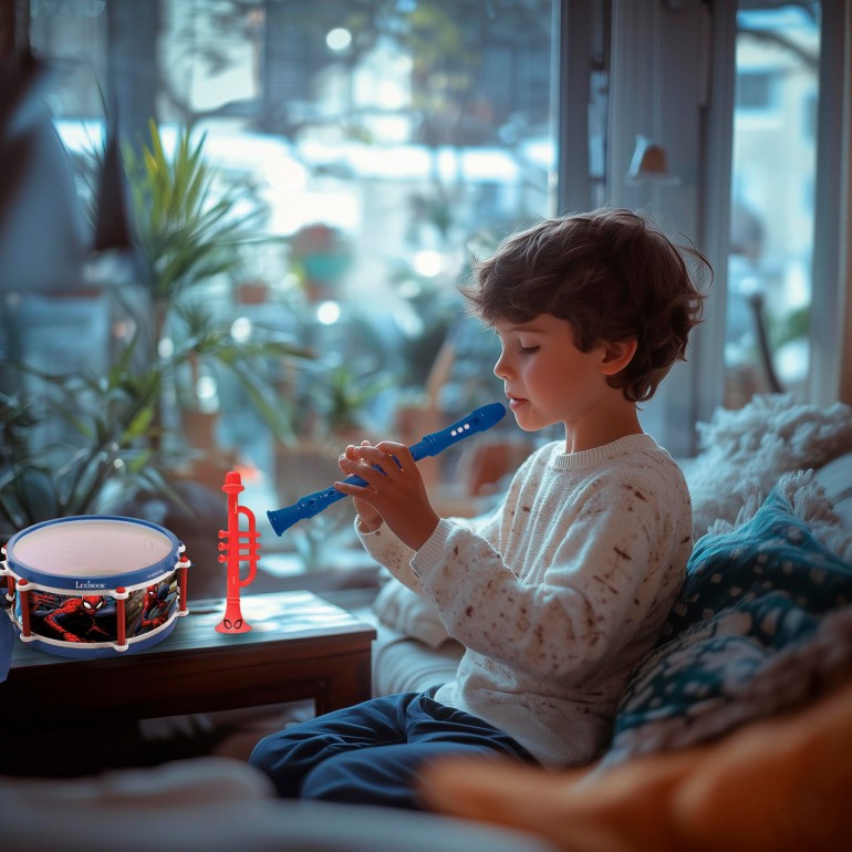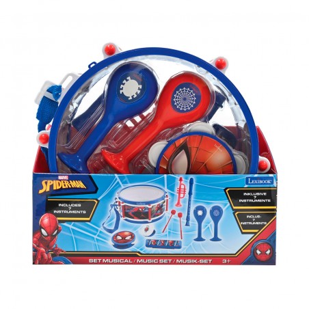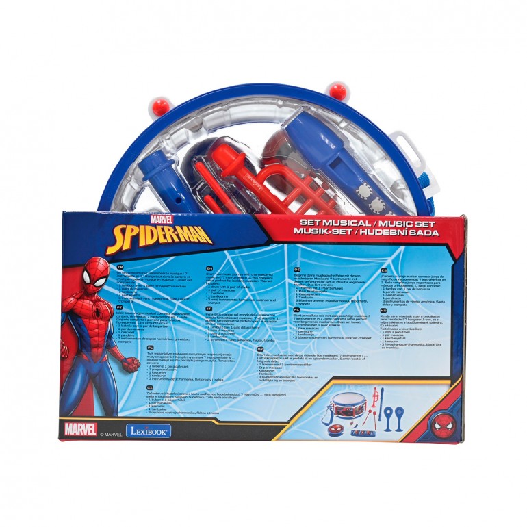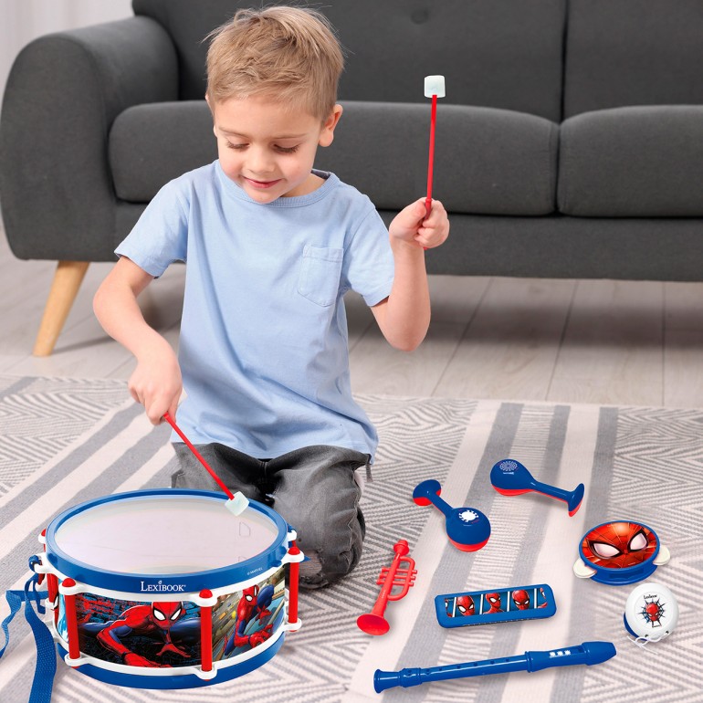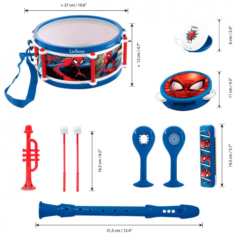 Set of 7 Spiderman instruments: drum, maracas, castanets, harmonica, flute, trumpet and tambourine.