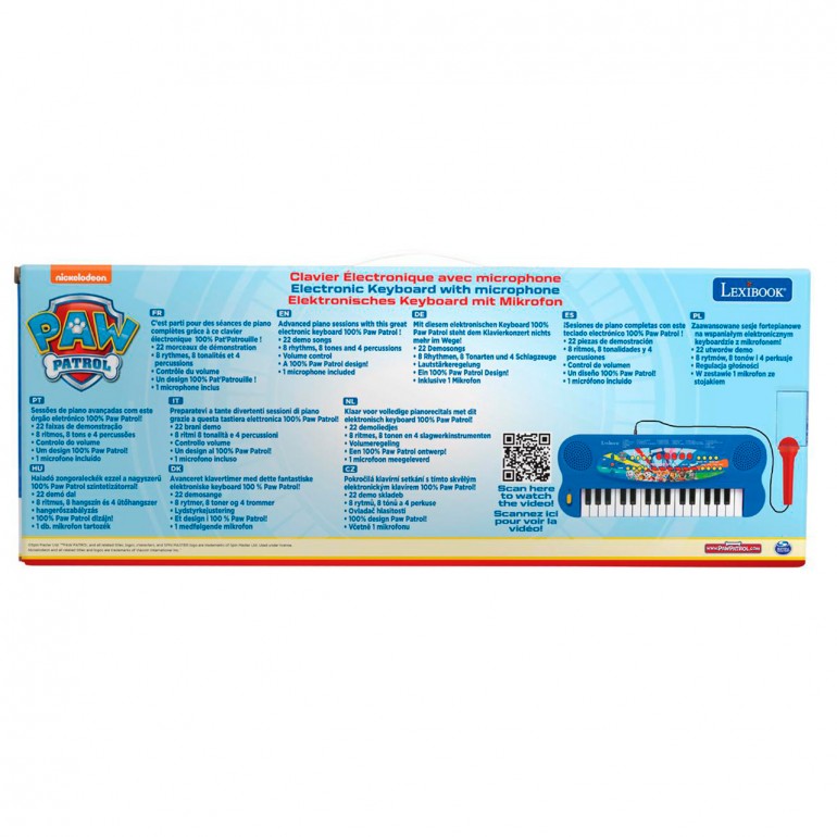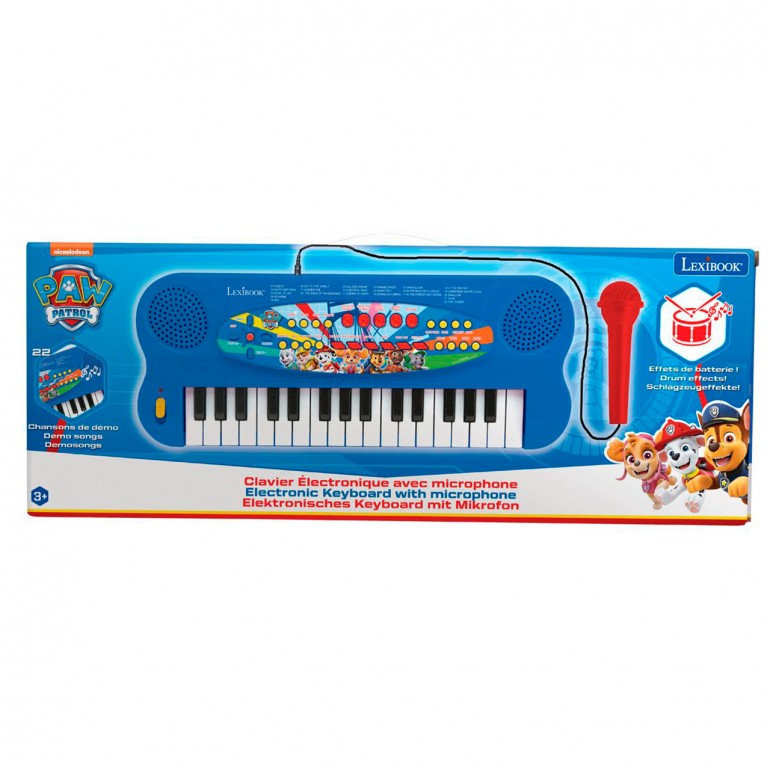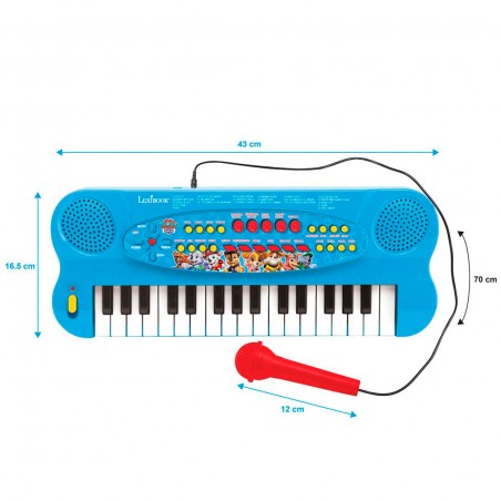 Let´s enjoy complete piano sessions thanks to this Paw Patrol electronic keyboard! 22 demo songs, 8 rhythms, 8 tones and 4 percussions. With microphone included.
