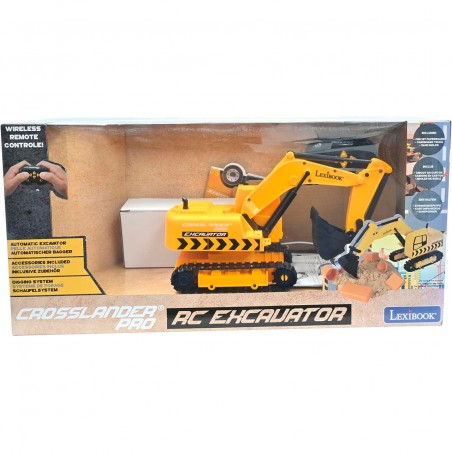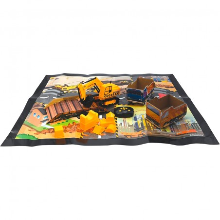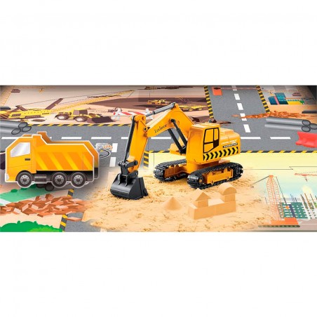 Multi-functional backhoe controlled with a remote control - articulated arm to scoop up sand and start your construction job! Includes a complete set of accessories, such as cardboard trucks and bridge, play mat and sand molds.