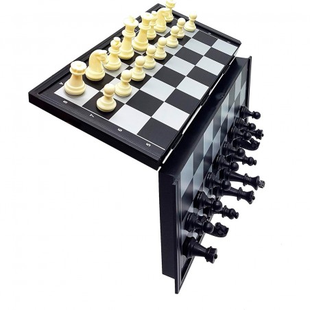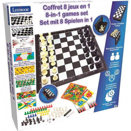 Magnetic version of these 8 board games! 8 essential games included in 1: chess, checkers, mill games, snakes and ladders, goose game, small horses, Chinese checkers and backgammon.