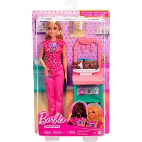 You can become a pediatrician with the Barbie Pediatrician play set! This set includes Barbie and her adorable baby patient, as well as doctor-themed play accessories - with the baby doctor exam table, the baby patient can look at the stars on the mobile or drink her bottle! Barbie wears a cheerful pink doctor´s uniform with a heart-print top and her stethoscope around her neck - she´s ready to make sure baby is very healthy!