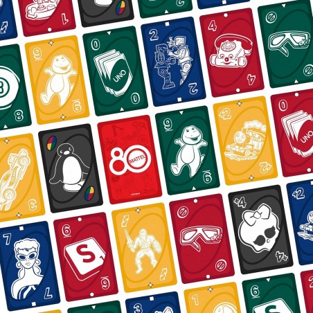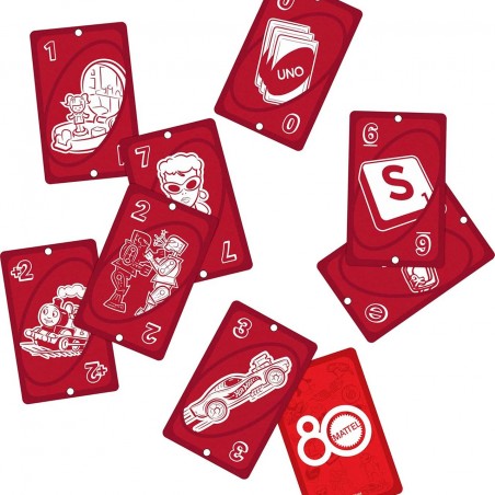 UNO players will love the graphics that showcase toys and games that Mattel has created over the years. The gameplay is the same as the classic card game where players match colors and numbers to get rid of all their cards - graphics include Hot Wheels, Barbie, Rock ´em Sock ´em Robots, Scrabble, Magic 8 Ball and more! Special ruby red package to celebrate Mattel´s 80th anniversary.