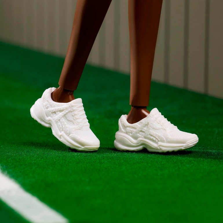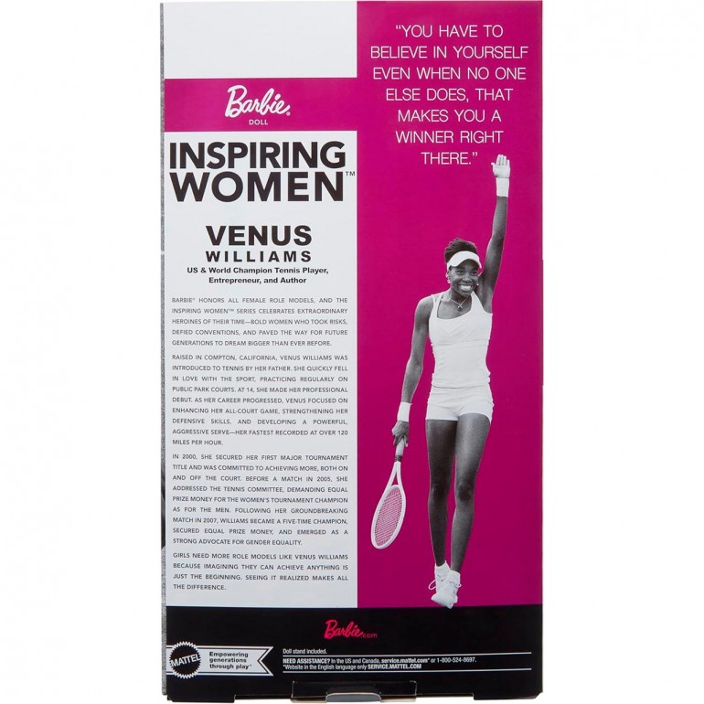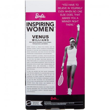 This Barbie doll from the Inspiring Women collection pays tribute to Venus Williams, a world champion tennis player who fought for women tournament winners to receive the same prize as the winners. The Venus Williams Barbie doll wears tennis gear, including a t-shirt, shorts, visor and sneakers. She includes a green stone necklace, just like the outfit she wore during her 2007 tournament victory.