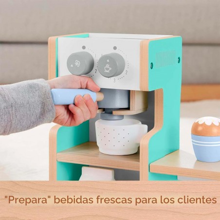 20-piece wooden coffee set for preparing and serving role-playing games suitable for preschoolers. Made from wood from well-managed, Forest Stewardship Council-certified forests; arrives in plastic-free packaging. Encourages imaginative play and storytelling. Includes store counter with register, coffee cup, spoon, milk carton, espresso filter, espresso capsule and play food pieces.
