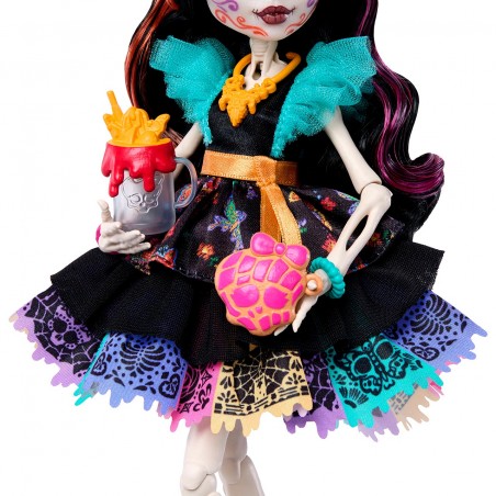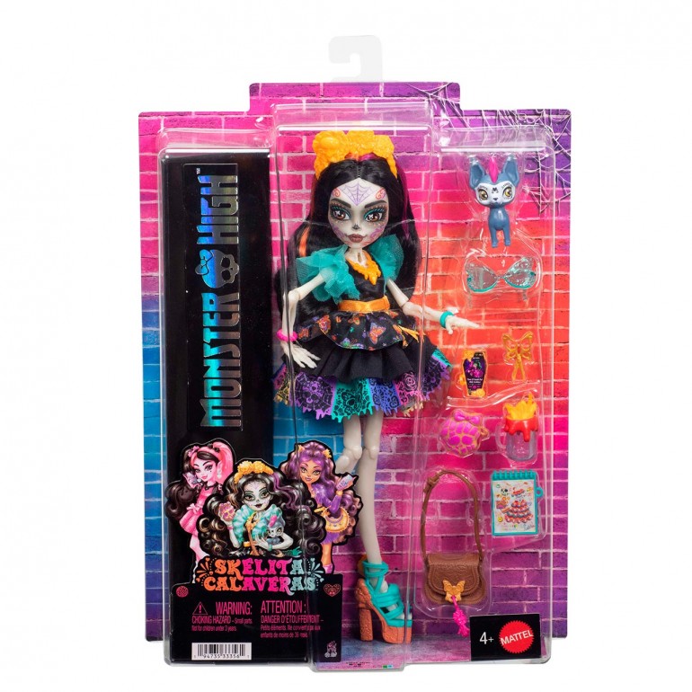 Meet Skelita Calaveras! This Monster High doll comes all the way from Mexico to shake her skeleton and get creative. She comes with seven cheerful and captivating accessories, plus her little xolo dog, Candelita. Boys and girls will love adding the creepily sweet Skelita Calaveras doll to their Monster High collection. The doll is fully articulated. The doll cannot stand on its own. Colors and decoration may vary.