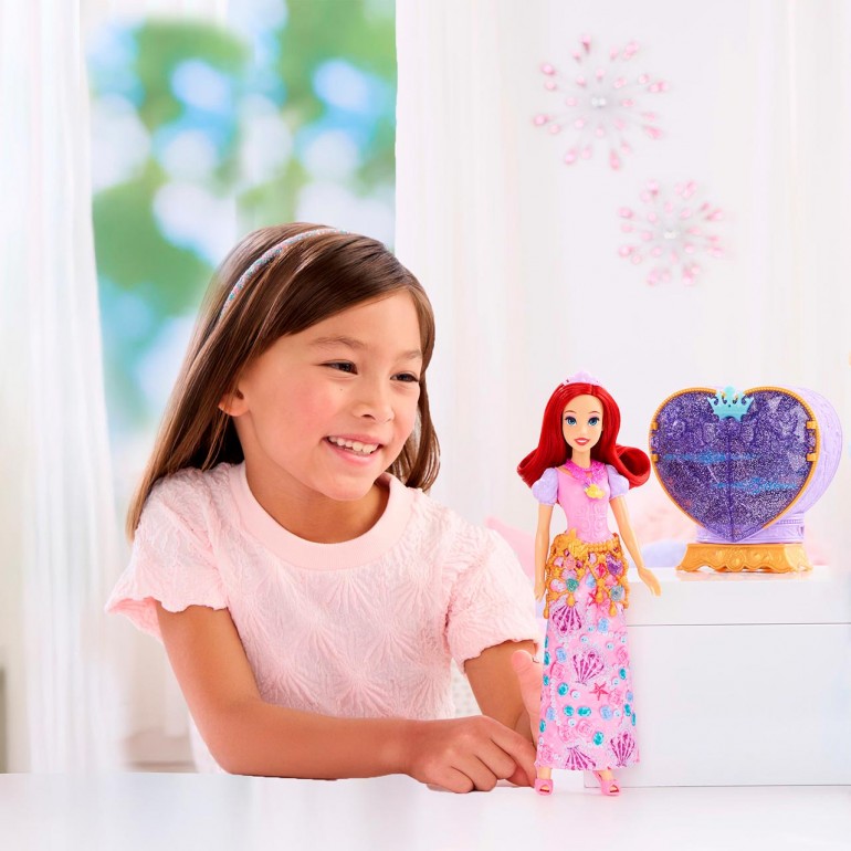 Discover the enchanted world of Disney Princesses with Ariel doll and surprise accessories from Jewel Reveal. The fun begins the moment girls and boys open the heart-shaped jewel at the top of the box, which reveals the beautiful Ariel fashion doll and surprise accessories inspired by the popular Disney movie "The Little Mermaid." Girls and boys can adorn the doll with jewelry and then attach the heart to the base to create a jewelry box to store accessories - perfect for Disney fans who love to play fashion-related games and have fun telling stories!