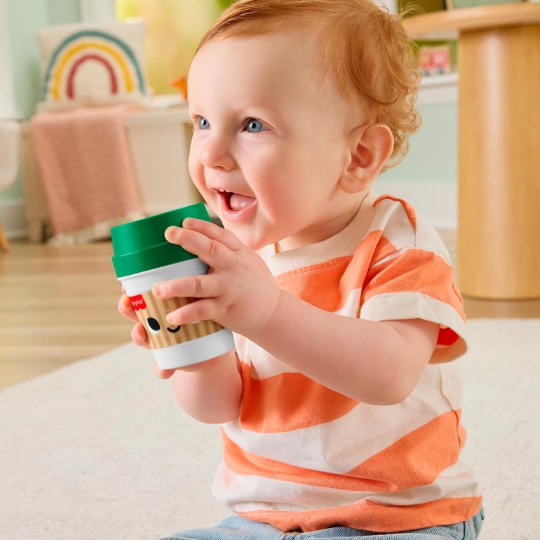 Start your baby´s day with a freshly brewed drink of sensory play with this Fisher-Price My First Moments Coffee Cup Teether. This 2-in-1 activity toy looks like a coffee cup to go and includes toy coffee beans inside that bounce like a rattle, plus a soft lid that can be used as a teether. The coffee cup is just the right size for little hands to grasp and explore, which helps develop fine motor skills and the senses of sight, hearing and touch.