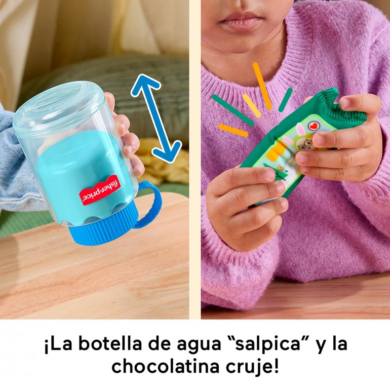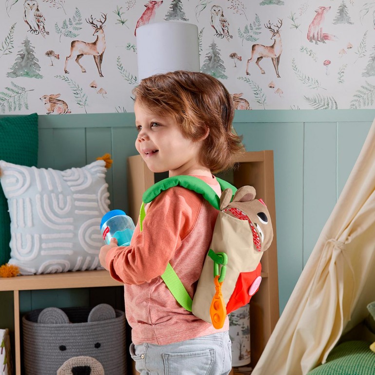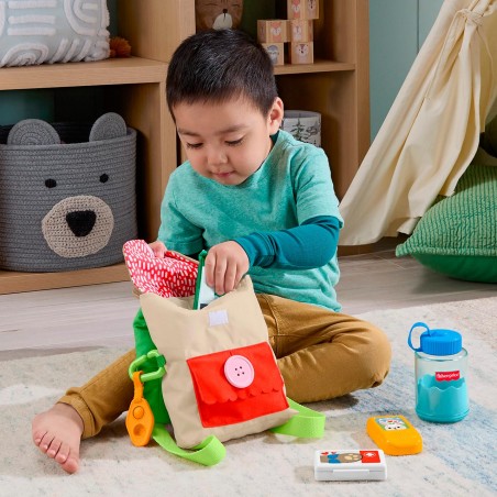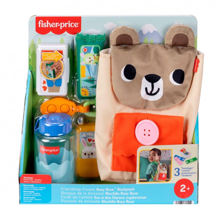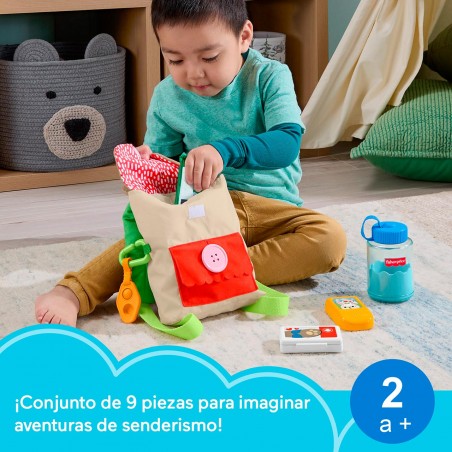A pack full of fun! Boys and girls will have everything they need for endless fantastic adventures in nature with this 9-piece set from Fisher-Price. Squeeze the bubbles on the rubber carrot. Pretend to chat with a hiking buddy with the toy walkie-talkie. Interactive activities, such as opening and closing the flap with buttons, help improve fine motor skills.