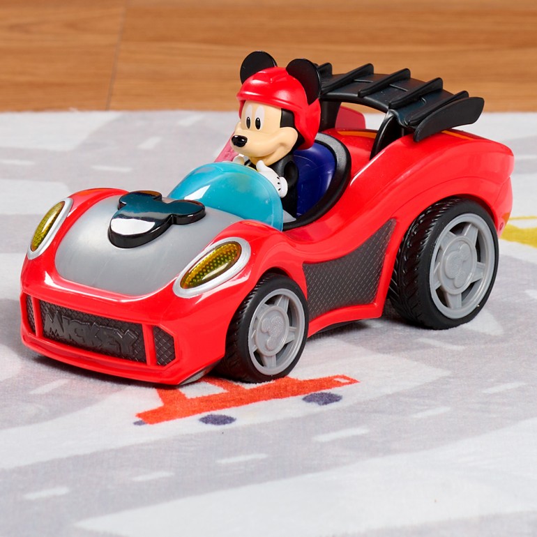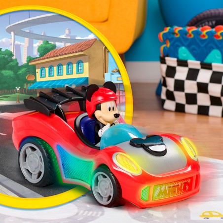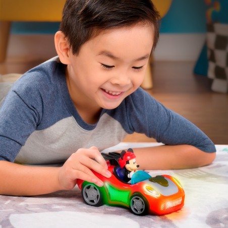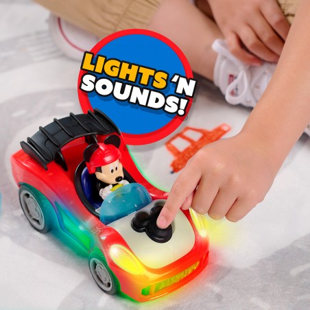 Get the kids´ playtime going with the Disney Junior Mickey Mouse Rev ´n Glow Racer vehicle. Inspired by the Disney Junior Mickey Mouse Funhouse series, this motorized toy vehicle moves, lights up and plays racing sound effects and Mickey Mouse phrases - Brummm, Brummm! Press the button on the hood to hear engine sounds and fun phrases as the race car springs into action. The vehicle glows with multi-colored flashing lights and speeds away! The non-removable Mickey Mouse figure stays in the driver´s seat.