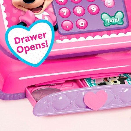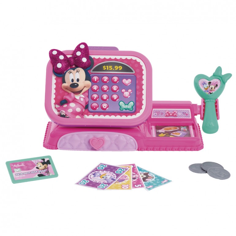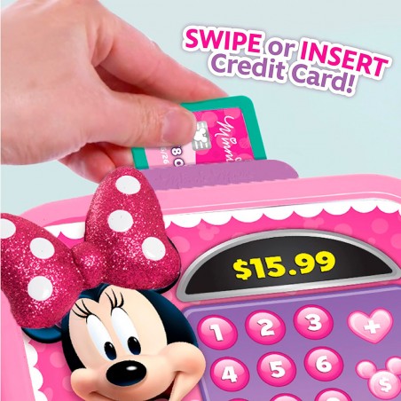 Endless shopping fun with Disney Junior´s Minnie Mouse Bowtique Cash Register! Includes fun Minnie Mouse phrases and realistic cash register sounds, toy scanner, cash drawer that opens, slot to swipe or insert toy credit card, toy coins and money, as well as a toy credit card. With this role-playing game that encourages imaginative play, kids will pretend to make fun purchases over and over again!