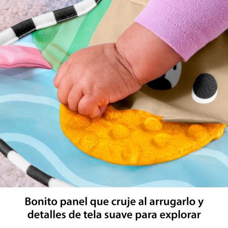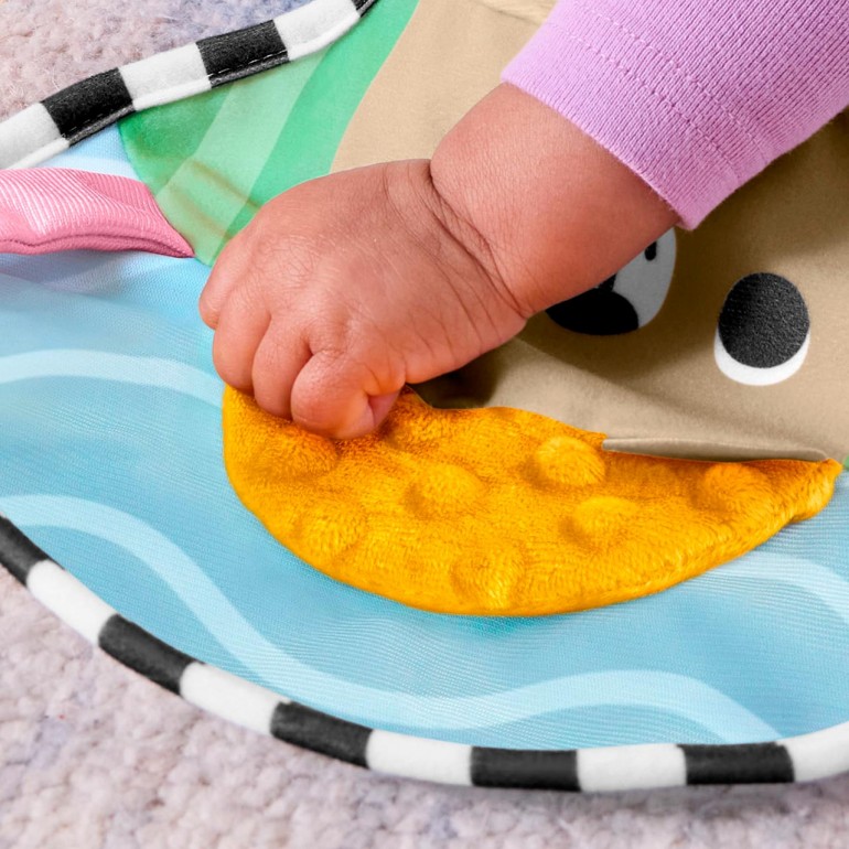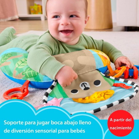 Let your baby enjoy playing tummy time in a fascinating forest full of fun activities with the Fisher-Price Sensory Adventures Tummy Time Play Pillow. This crescent-shaped cushion features a cute teddy bear design, a large crinkle-crinkle panel with soft fabric details to discover and two dangling toys that baby can nibble and shake to make them rattle. By pushing up to discover all the fun activities on the cushion, little ones will strengthen their neck and trunk muscles, while reaching and grasping the toys will develop fine motor skills.