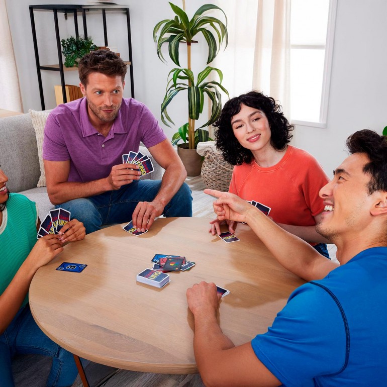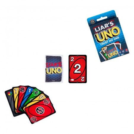 Fans of UNO will love this version of the classic card game, where it´s all bluffing and the best liar wins. The player plays a "Liar´s Card" face down and then says out loud which one it is. Is he telling the truth or lying? If someone challenges him and finds out he was lying, the liar has to draw a card. But if he tells the truth, the player who accused him has to draw a card. To win, make a poker face, pretend and remember to shout "UNO" when you have only one card left.