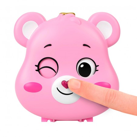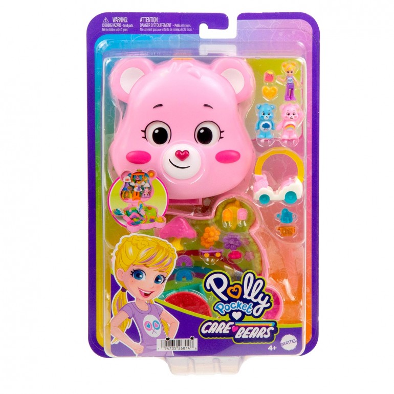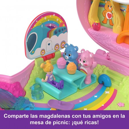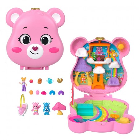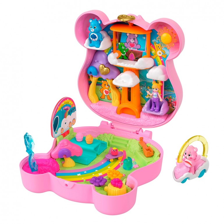 Loving Bears get tiny with Polly Pocket in this adorable collaborative case with Polly doll and Loving Bears figures! On the outside the case is a Love Bear you can wink at, but if you open it up, you´ll find Mucho Mimo, a sunny, rainbow-filled world where little ones can play all day long. The set includes three dolls and themed accessories, such as the Multicolor Osomobile, the iconic cloud and rainbow-shaped vehicle of the Love Bears. Polly doll loves to enjoy the view from a comfy chair in the clouds. The Lovely Bears dolls can have a picnic in the park or take turns riding up the tree house elevator to play alongside Polly doll in the clouds.