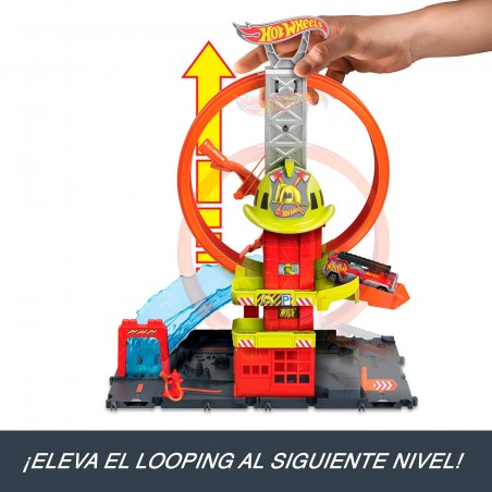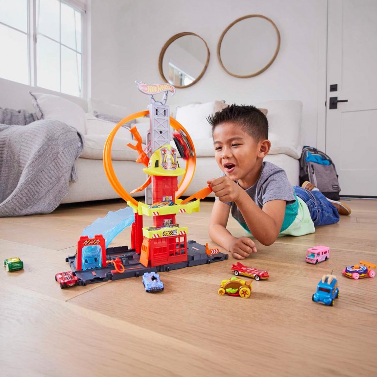 The Hot Wheels City Superloop Firehouse playset pays homage to a favorite location for little ones with an adjustable multi-level loop and a looping booster that launches cars through the park and down a see-through, water-like ramp. The base features exciting track details that inspire creative storytelling and connectors to link it to other Hot Wheels sets. A Hot Wheels fire truck is included.
