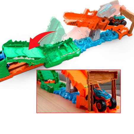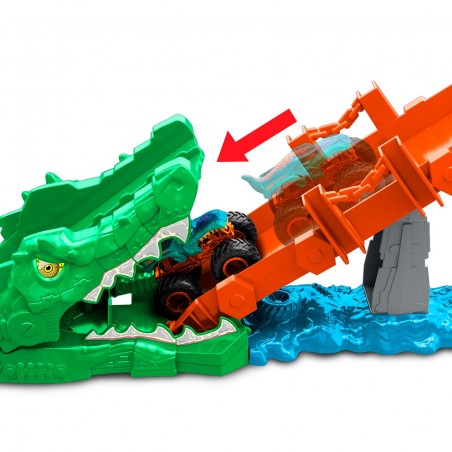 Mega-Wrex races to escape and defeat a hungry crocodile in the Hot Wheels Monster Trucks Crocodile Crash Challenge game. Load Mega-Wrex into the launcher and hit hard enough to make sure Mega-Wrex can conquer the jump, race across the saw bridge and off to new adventures. Hit just right so that the transparent saw bridge knocks out the crocodile. If you haven´t thrown enough, Mega-Wrex will turn around and eat. Reset is easy so kids can play again and again. Includes a 1:64 scale mega-wrex with unique decoration.
