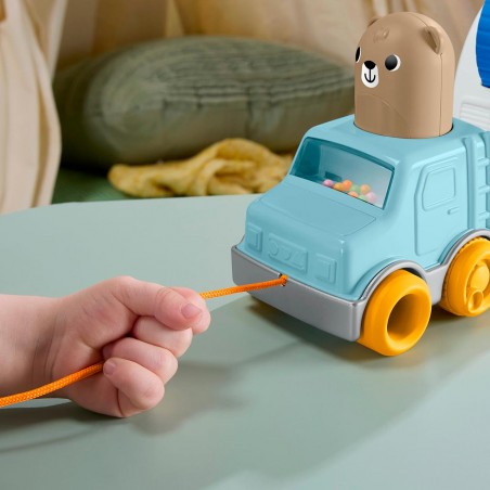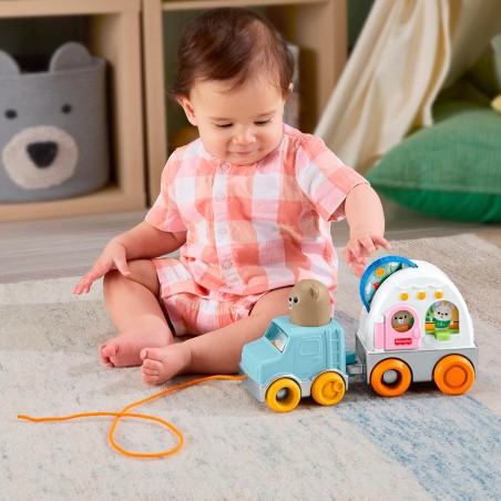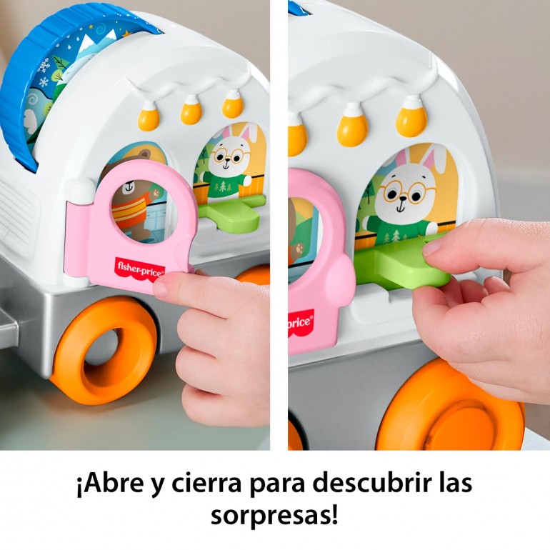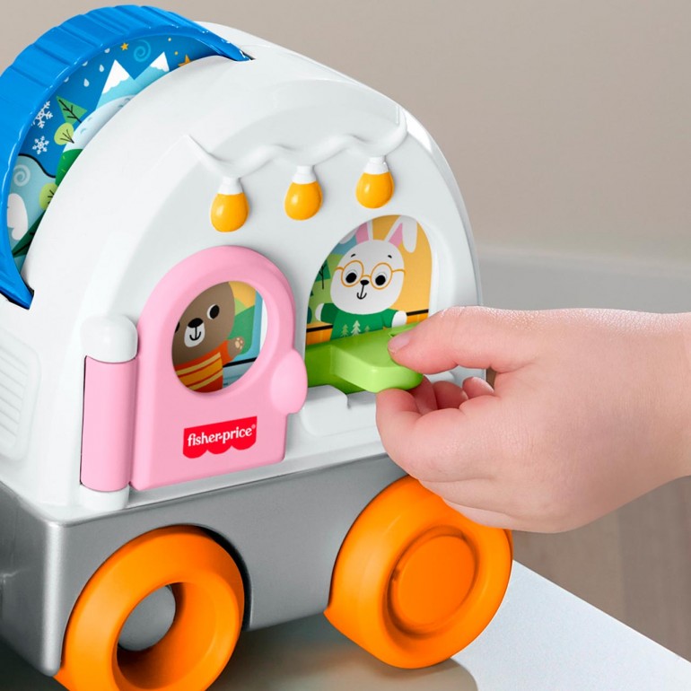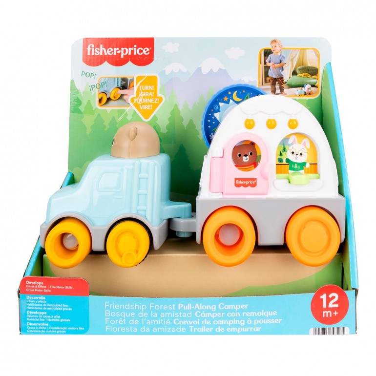 Little campers can embark on exciting adventures where they´ll develop their motor skills with this baby toy, the Fisher-Price Friendship Forest Towable Caravan. This adorable camping-themed crawlable toy includes an SUV with wheels and "pop" sounds, plus a trailer camper with fun hands-on activities for little ones to explore, such as a day/night spinning disc, a door and a window with a window for hide-and-seek play. The toy´s fun "pop" sounds and bouncy movements when dragged encourage gross motor skill development.