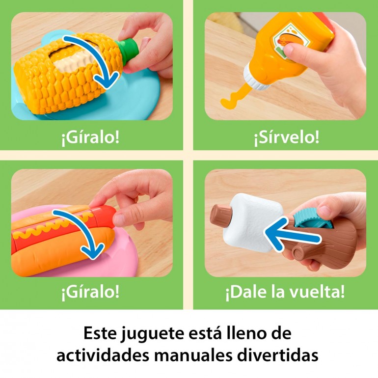 Little ones can enjoy hours of imaginative "outdoor" play with the Fisher-Price Friendship Forest Activity Barbecue set. This 14-piece camping-themed pretend play set includes a toy grill with color-changing grates for cooking play, plus a variety of classic barbecue foods, including an assembleable hamburger patty, hot dog roller, corn on the cob grill, marshmallow skewer and cooking and serving accessories. Boys and girls will love hosting endless fun barbecues!