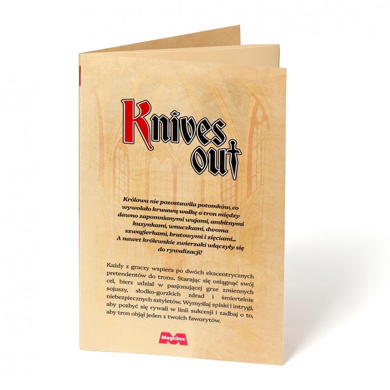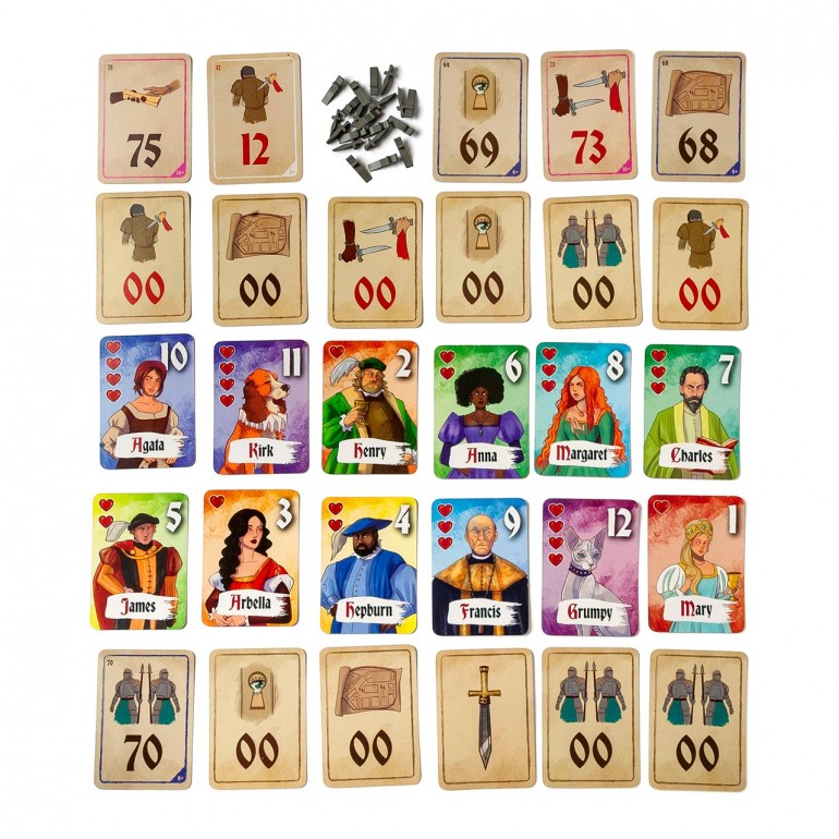 The queen has no descendants and the succession has triggered a bloody competition between forgotten uncles, ambitious cousins, granddaughters, two brothers, sisters-in-law and sons-in-law... all eager to claim the throne. Even the royal pets are in the running for the position! Each participant backs two of the eccentric aspirants to the throne, sharing goals and mediating in a game of shifting alliances, bittersweet betrayals and knives in the air. Devise plots to overthrow your rivals in the line of succession and ensure that one of your candidates rises to the throne. The living contender who is highest in the line of succession will be next in line to reign.