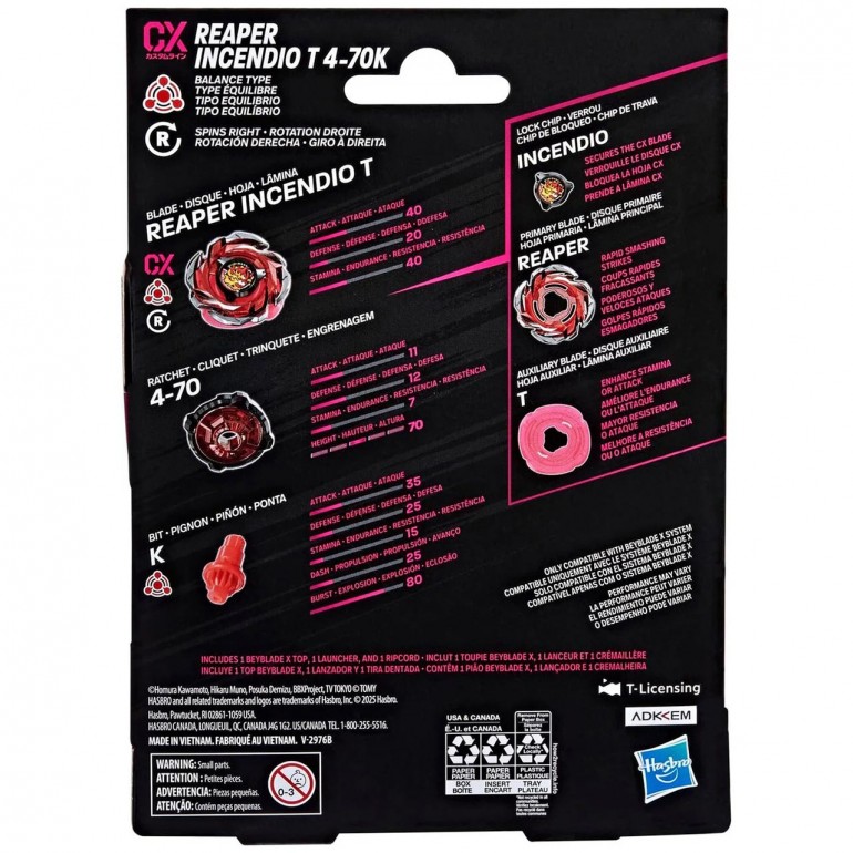 Beyblade X brings the thrill of competition with intense top battles that will motivate aspiring Beyblade masters to up their game. Assemble your tops, load your launchers and... 3, 2, 1 Let it rip! Includes Takara Tomy-designed Beyblade X top and launcher made from authentic metal castings. Reaper Incendio´s main blade delivers powerful, lightning-fast strikes, and the auxiliary blade increases stamina or attack.