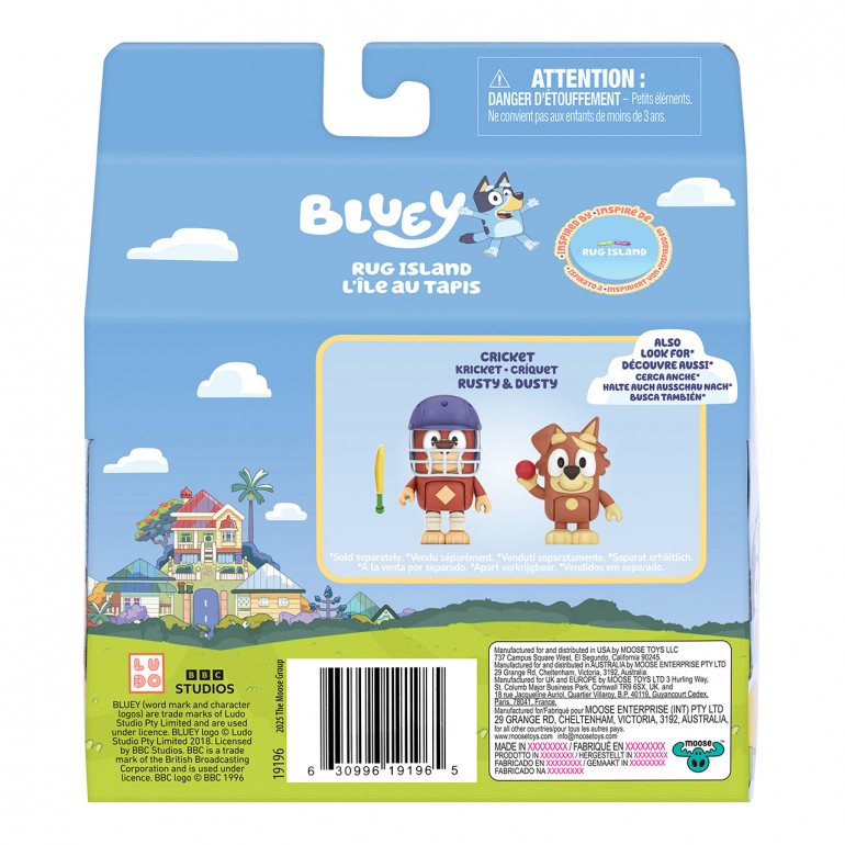 Take home the fun and imagination of Bluey and his family with the Carpet Island 2-Figure Pack or discover the Cricket 2-Figure Pack, which includes Rusty and Dusty. The figures measure 6-7.6 cm have articulated bodies and arms, making them perfect for play and fun poses.