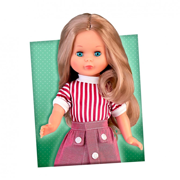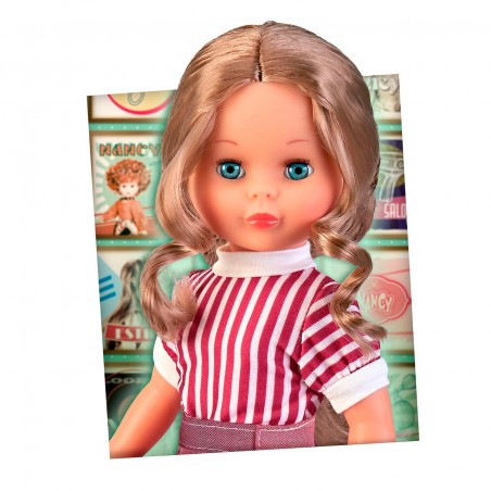 Extraordinary Nancy doll Trousseau Hairstyles Collection, Reissue 2024. Includes a hair trousseau with two braids and a hairpiece, allowing you to experiment with different styles and hairstyles. She wears a magnificent 2-piece dress in white top with vertical red stripes, skirt in the style of the 80´s and light boots.