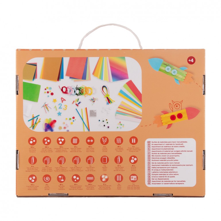 A complete set of 1300 pieces with a wide variety of creative materials for children to create freely or get inspiration from the example book.