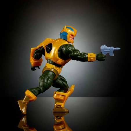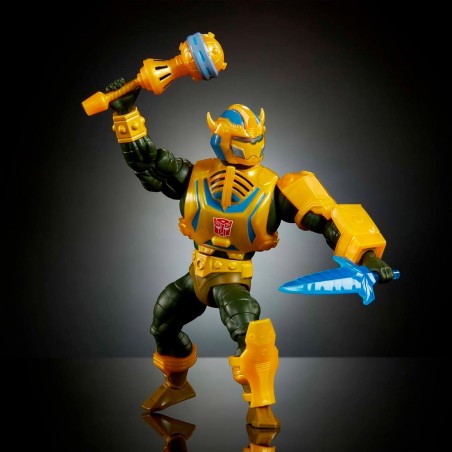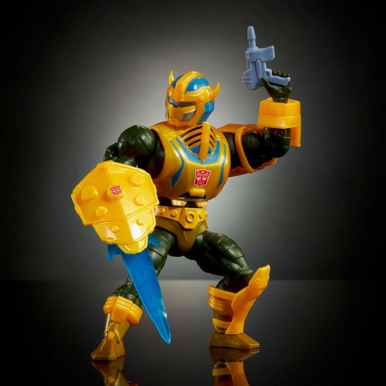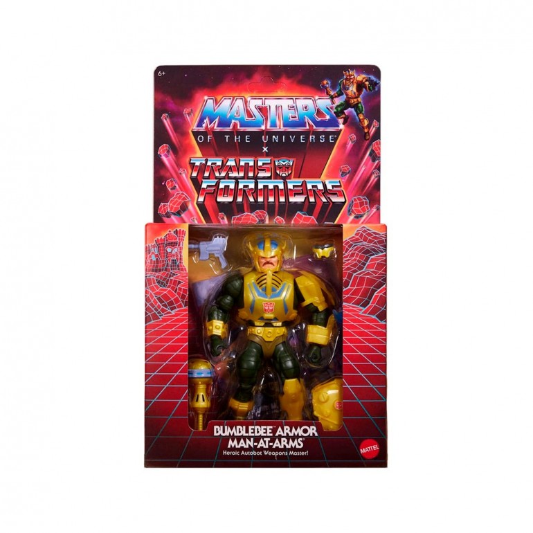 This Origins action figure is the result of a spectacular crossover between Masters of the Universe hero Man-At-Arms and Transformers hero Bumblebee. This 13.97 cm scale figure of the heroic Autobots master armorer has 16 movable joints to strike battle poses and perform action moves. Bumblebee´s removable armor includes the helmet visor and one piece of armor for his shoulders, one for his wrists and one for his legs - his sword and shield combine into an Energon dagger!