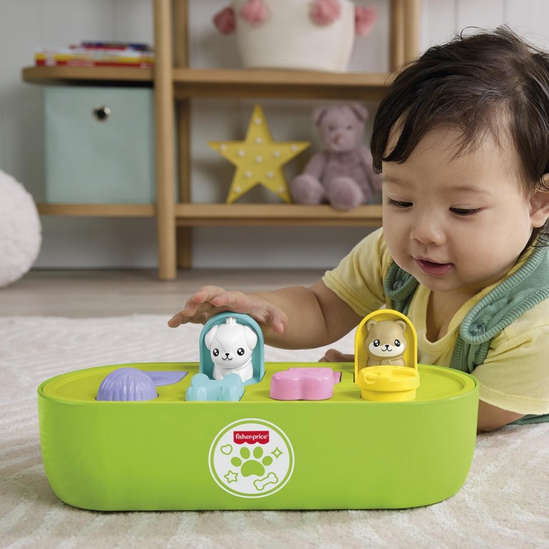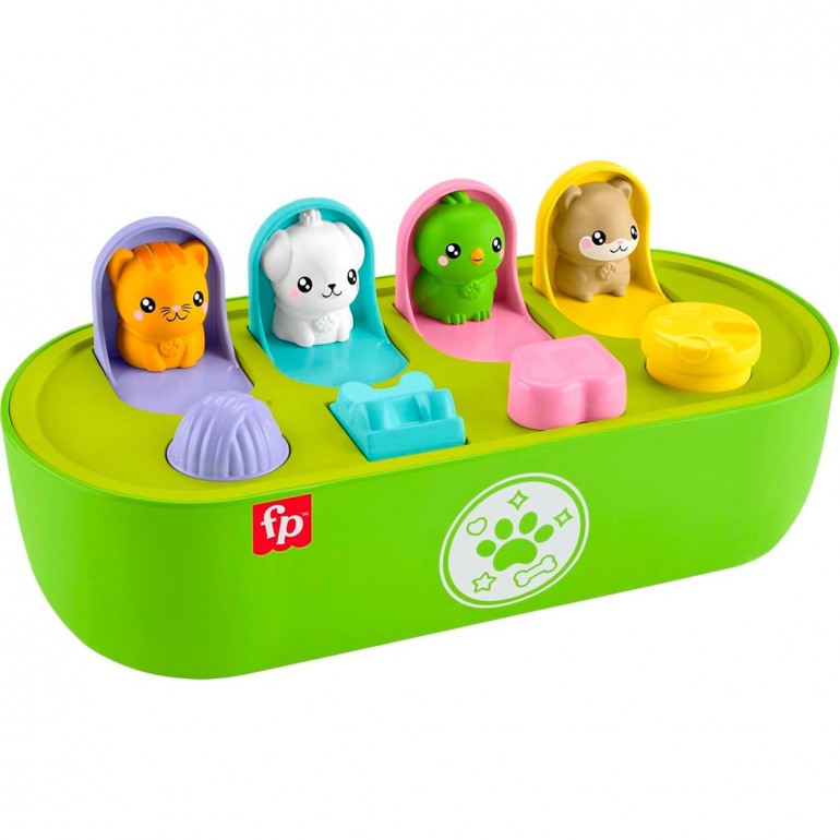Pet-themed pop-up activity toy that presents baby´s cause and effect while playing - surprise! Each activity reveals a pop-up animal including cat, dog, parakeet and hamster. 4 small hand activities for spinning, switching, pushing and shoving. Fun sounds reward any activity and promote baby´s sense development.