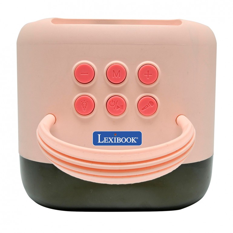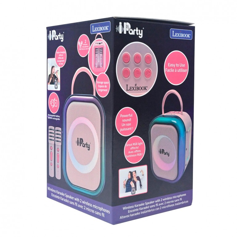 The rechargeable karaoke speaker and two microphones is designed for children who love to sing and have fun with their friends. The speaker is equipped with two wireless microphones located directly on the device in a convenient storage compartment, making it easy to carry and store. On the back of the speaker is a control panel with buttons for volume adjustment, mode selection and other functions, including a button to activate light effects that add a fun visual touch when singing.