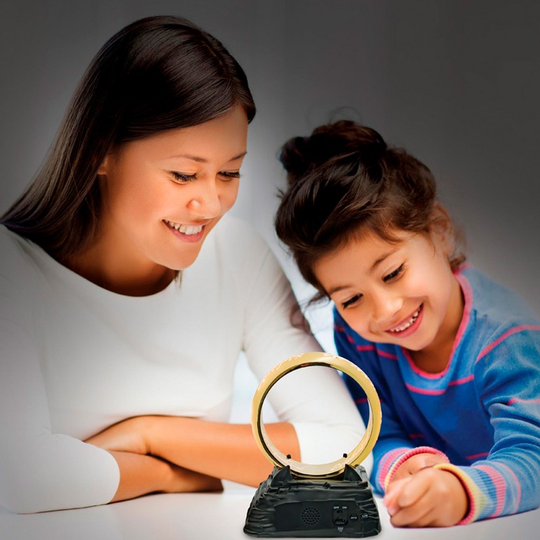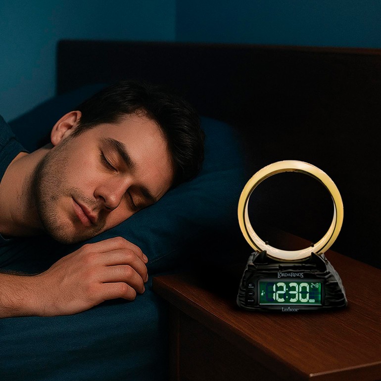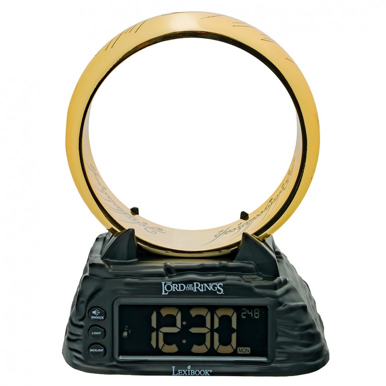 An iconic alarm clock that combines a unique design with practical functionalities for everyday use, inspired by The Lord of the Rings. LCD display and on/off function! Snooze function, night light integrated with the alarm and temperature display.