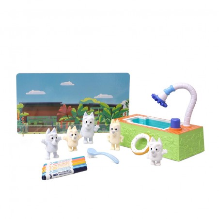 A fun new creative adventure with the Bluey family! Children can decorate the Bingo, Bluey, Bandit, Chilli and Muffin pets with the included markers. When it´s time to set off on a new family adventure, kids can clean their pets with the brush and give them a bath in the real working bathtub.